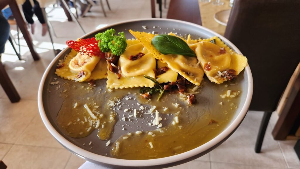 Setas boletus y cebolla salteados en mantequillas y brandy con paté de trufa y parmesano.