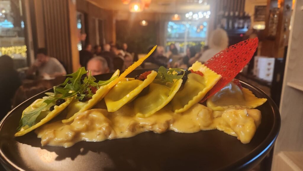 Salmón ahumado y gambas en salsa suave marinera con un toque de caviar.