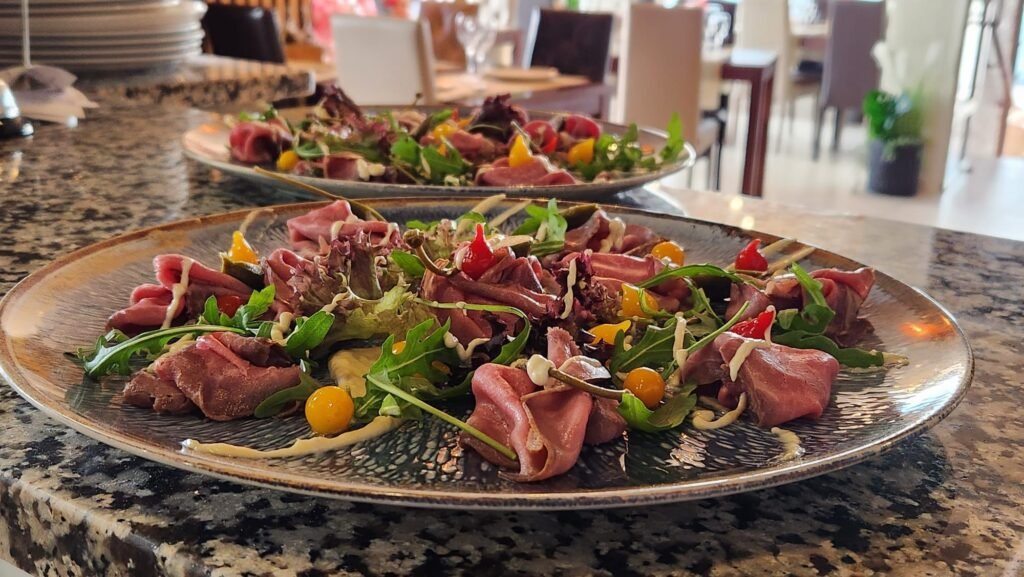 Solomillo de ternera marinado, rúcula, parmesano, AOV y zumo de limón.