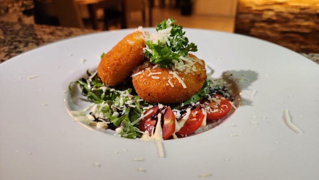 2 croquetas de quesos fundidos, rúcula y salsa de yogurt.