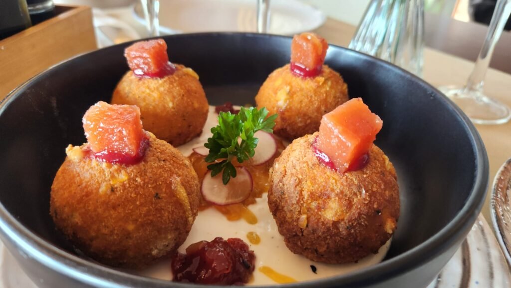 4 Croquetas de arroz risotto con parmesano y queso gouda, acompañadas de membrillo y una salsa suave de parmesano